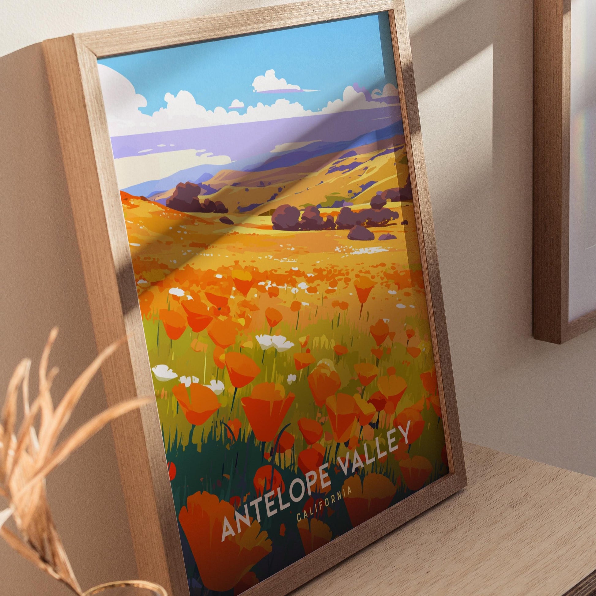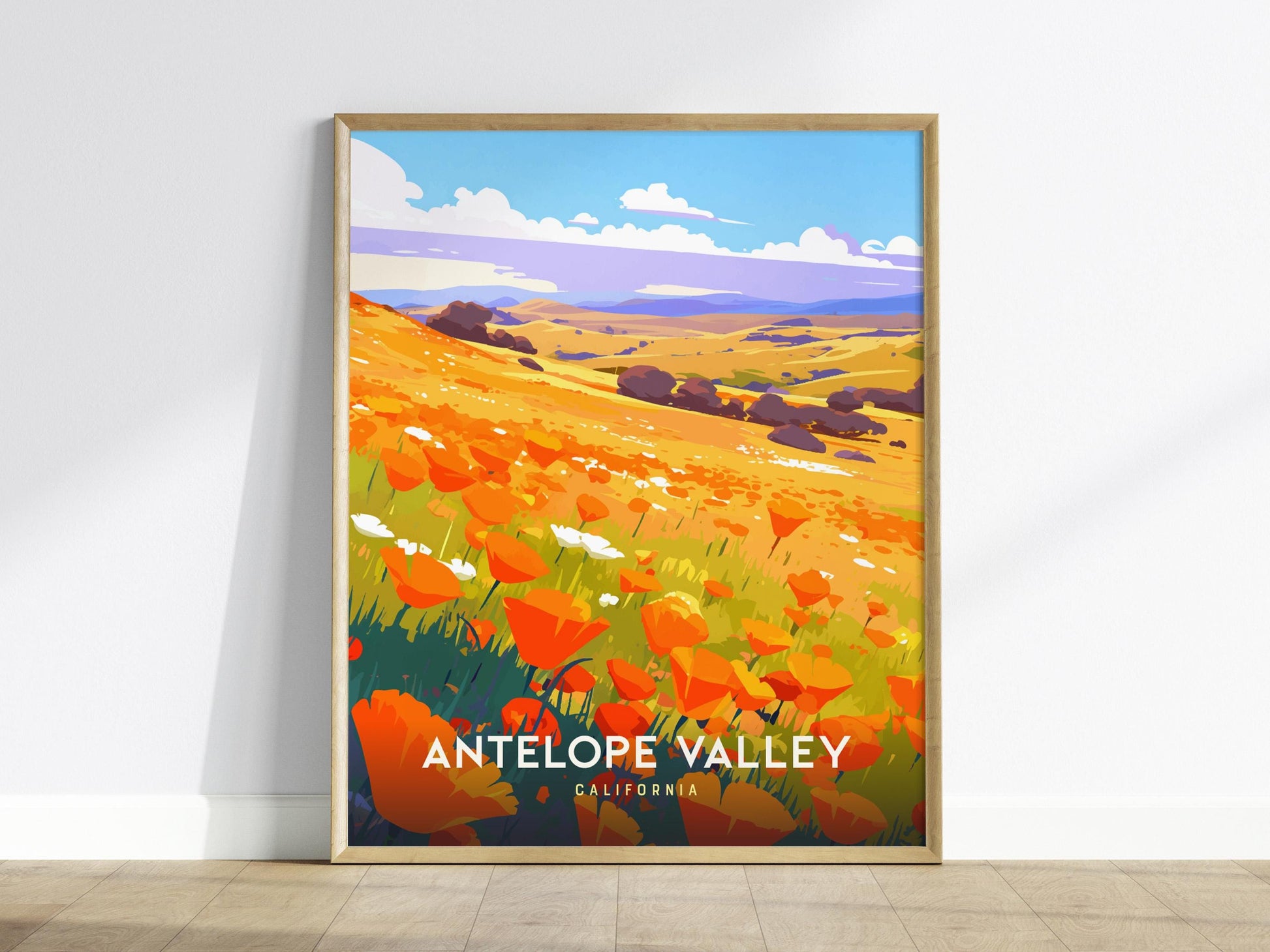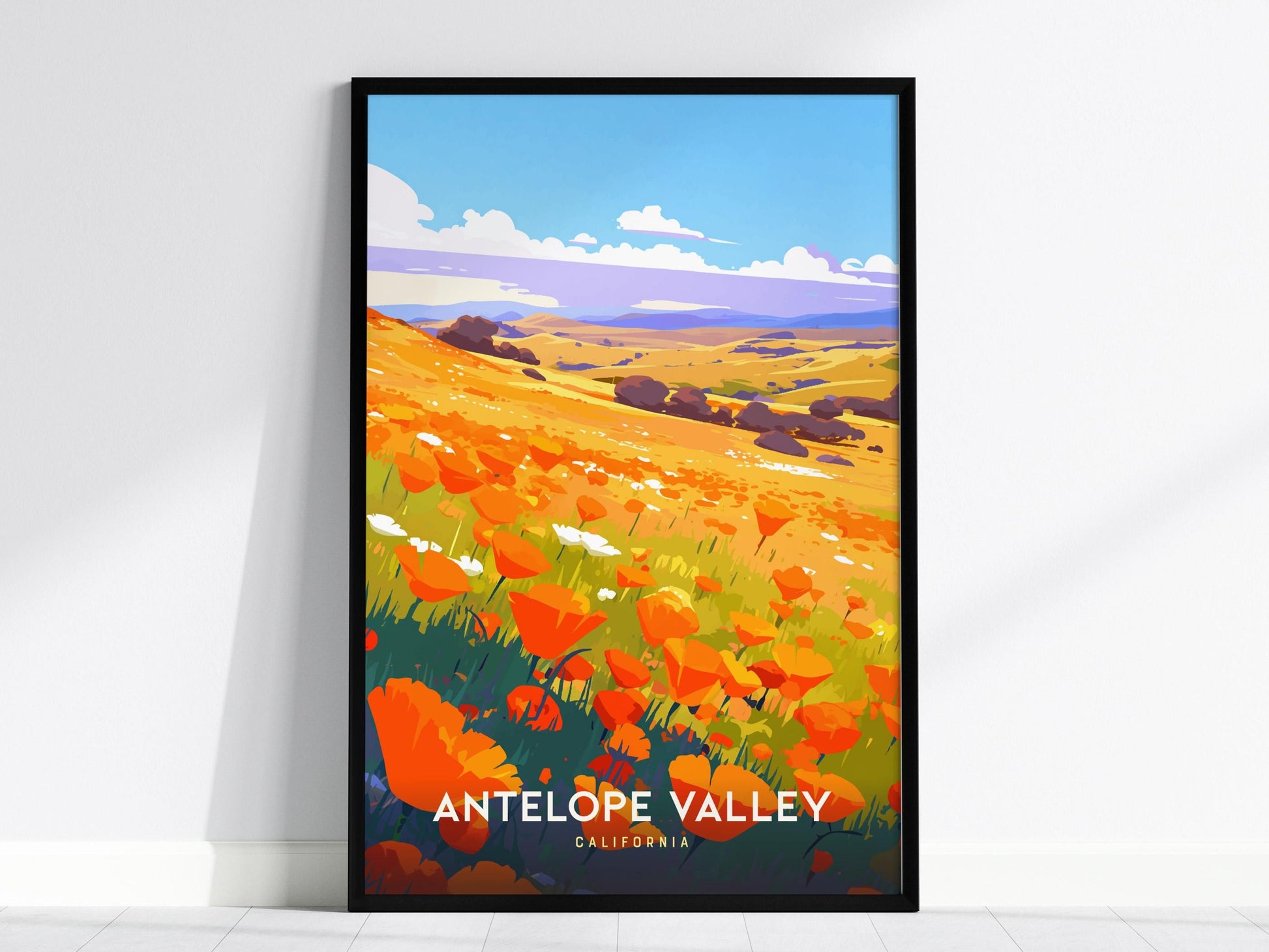 Celebrate the fleeting beauty of California’s springtime super bloom with this Antelope Valley Poppy Field Poster by Swell Scenes. Each year, the Antelope Valley transforms into a golden sea of wildflowers, where vibrant orange poppies blanket the rolling hills beneath endless blue skies. This artwork captures that breathtaking moment when the desert bursts into color—bringing warmth, joy, and nature’s magic into your home.