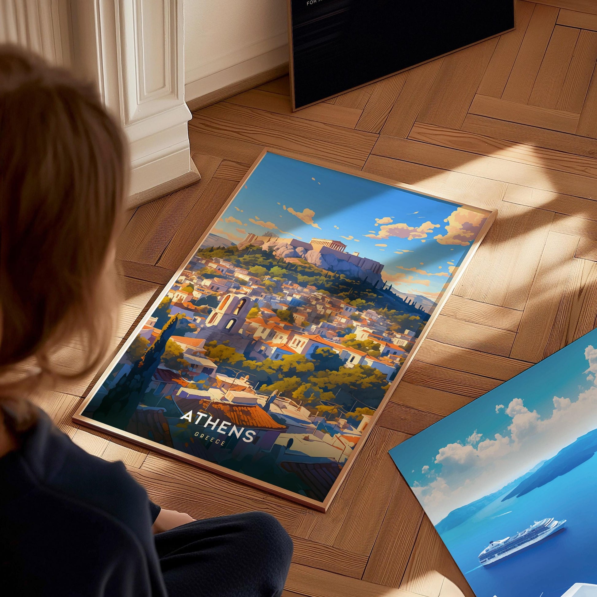 Step into the birthplace of Western civilization with this elegant Athens, Greece Poster by Swell Scenes. Featuring the legendary Acropolis and Parthenon bathed in golden Mediterranean light, this artwork celebrates the timeless skyline of one of the world’s oldest and most influential cities. Its warm, sunset hues and modern-vintage illustration style bring a piece of ancient history to your home or office.