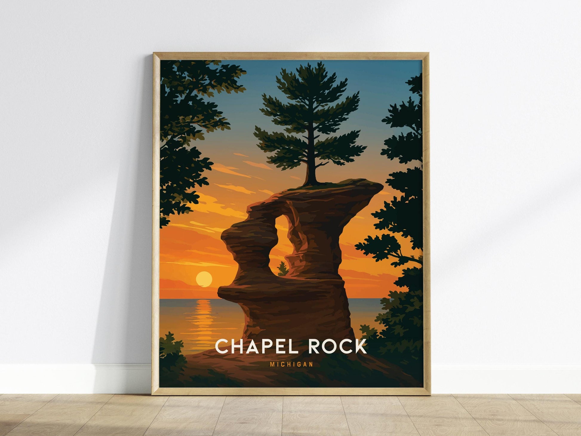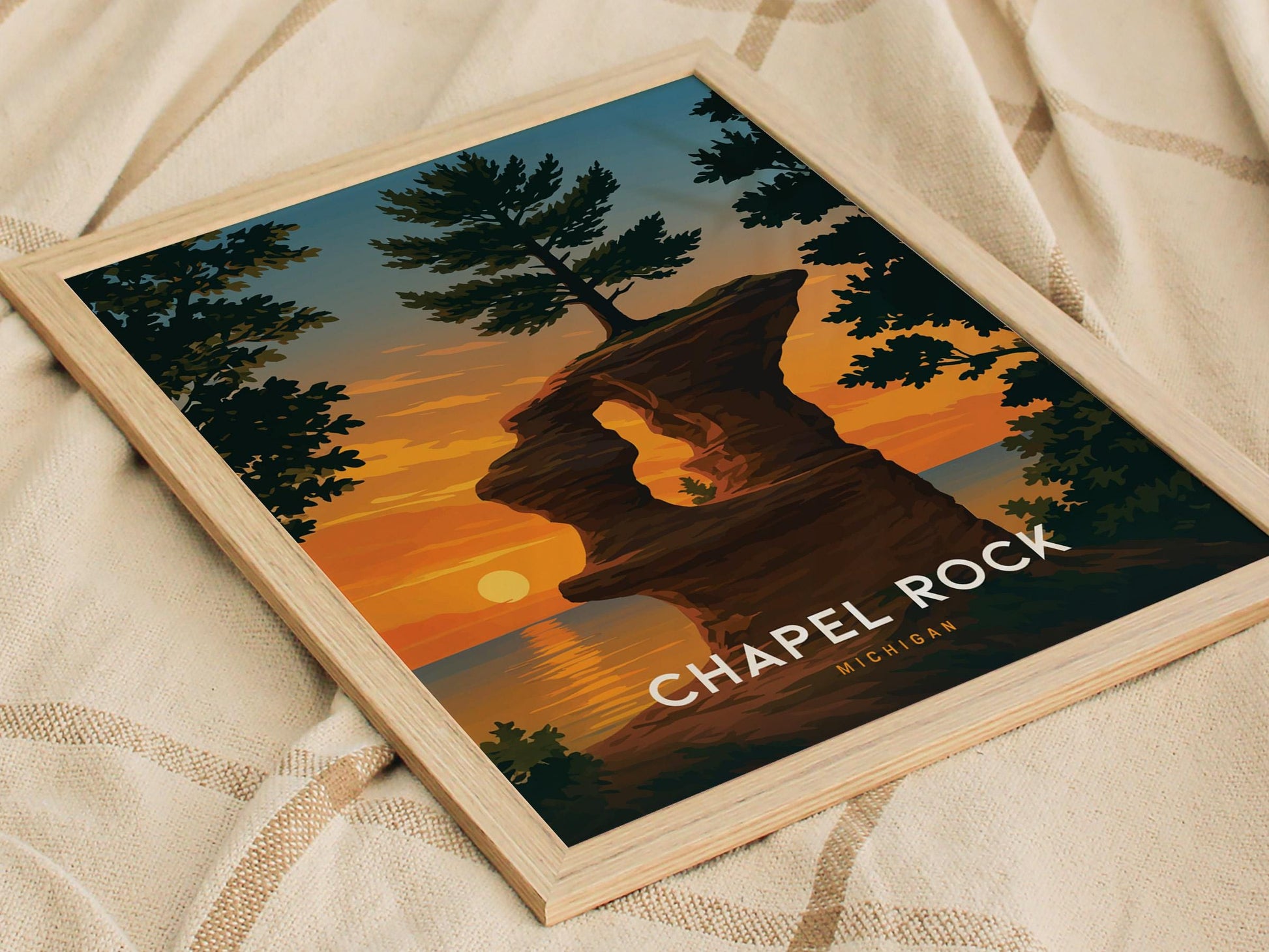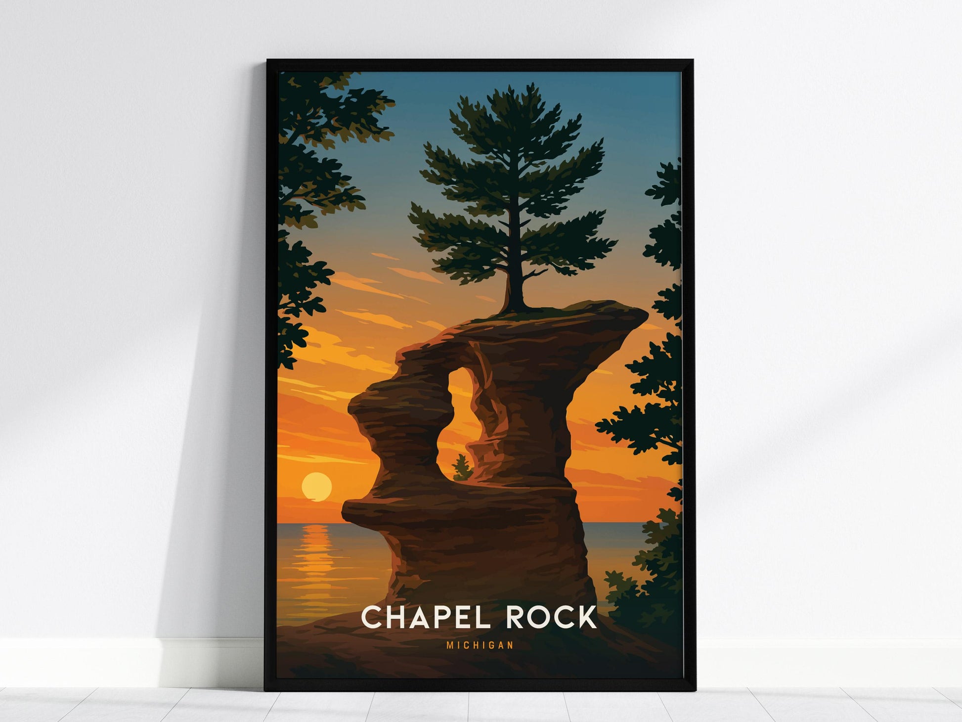 - Striking Design: Features Chapel Rock framed by the glowing colors of a Lake Superior sunset in a modern vintage style.