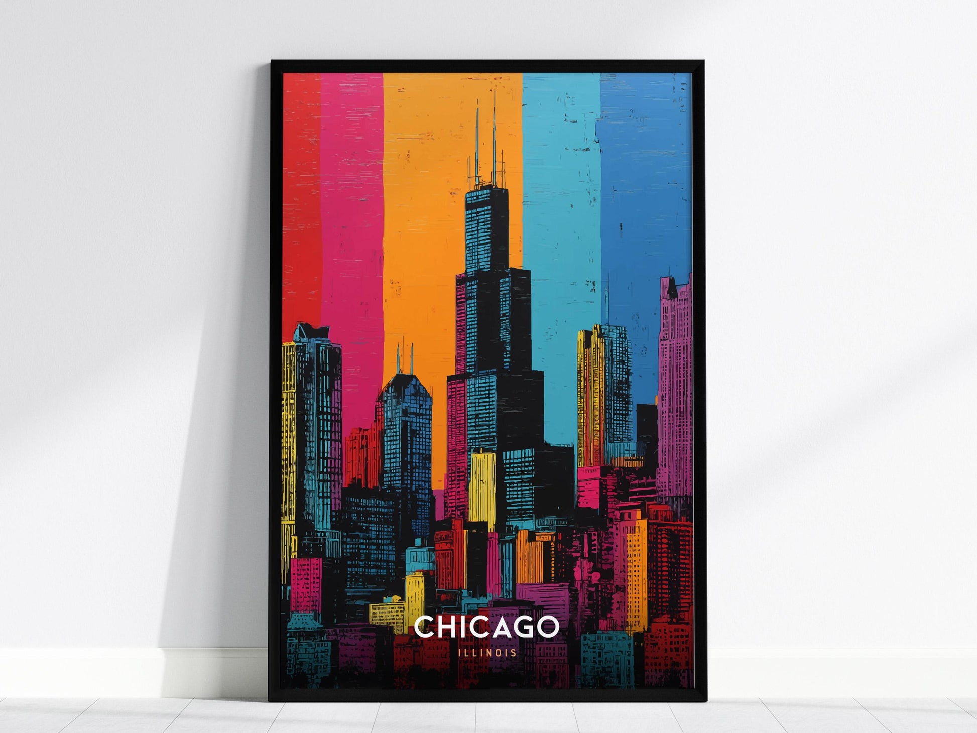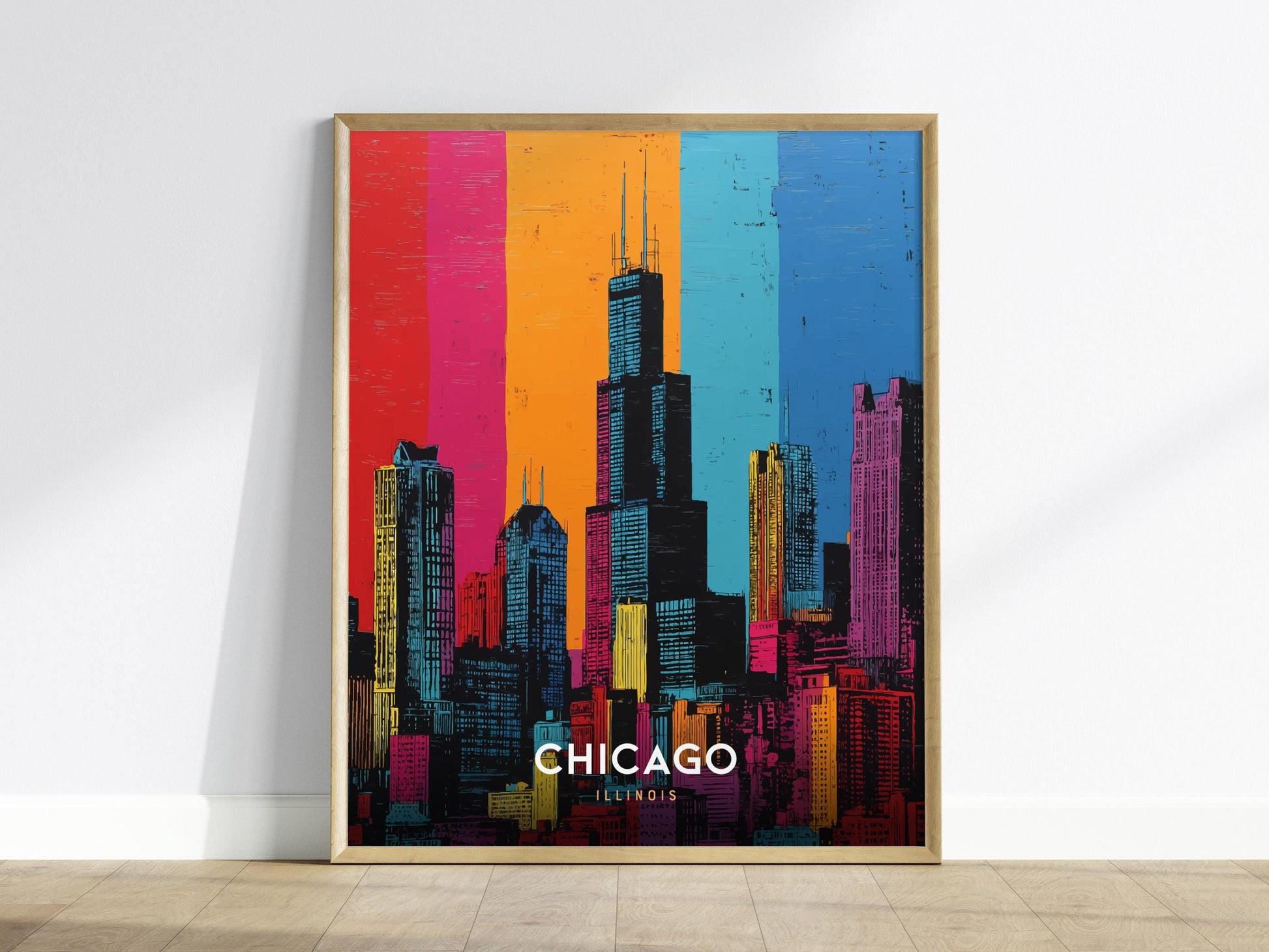 - Striking Pop Art Design: A Warhol-style depiction of Chicago’s skyline rendered in dynamic color blocks and graphic textures.