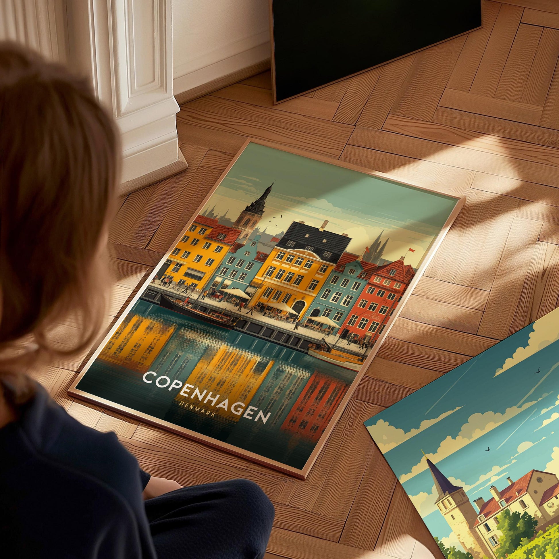 Copenhagen, Denmark’s capital, blends modern innovation with centuries of charm. Its Nyhavn harbor—lined with 17th-century townhouses, cozy cafes, and wooden ships—is one of the city’s most beloved landmarks. Once home to fairy-tale author Hans Christian Andersen, Nyhavn remains a symbol of Denmark’s creative spirit and seaside culture. This poster captures its warm colors, timeless atmosphere, and Nordic serenity in a single modern composition.
