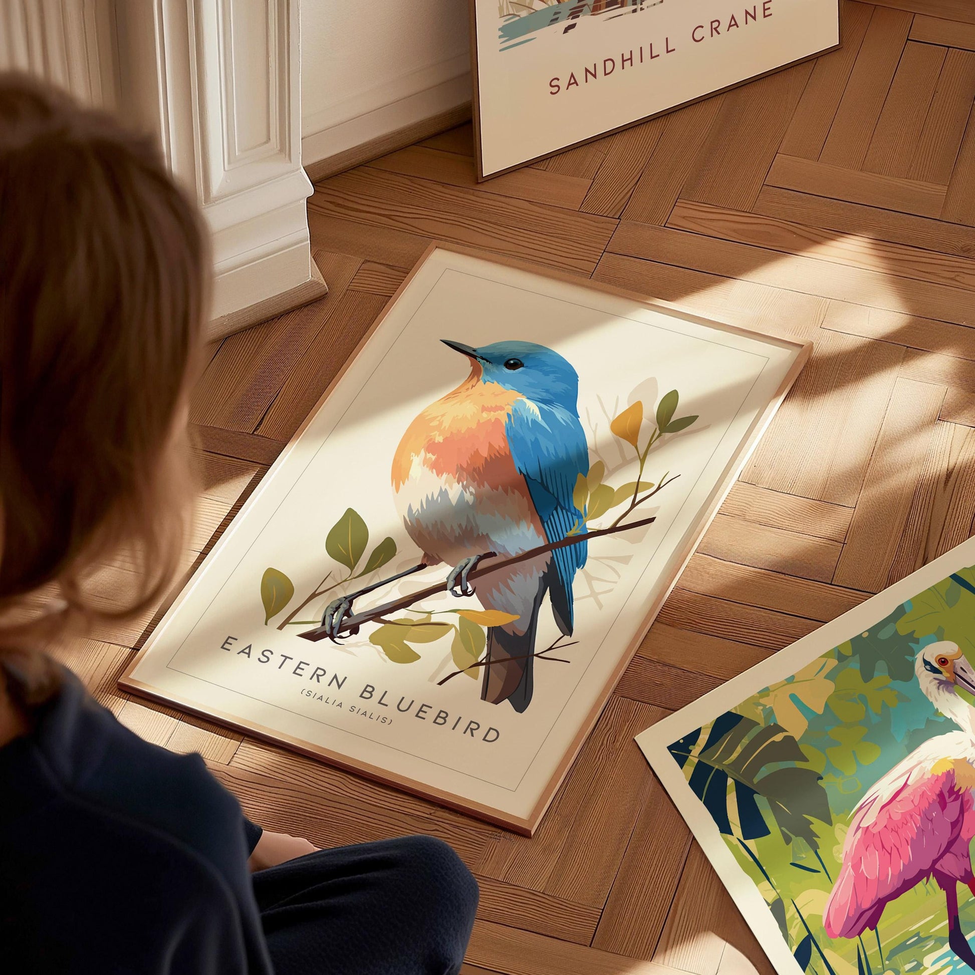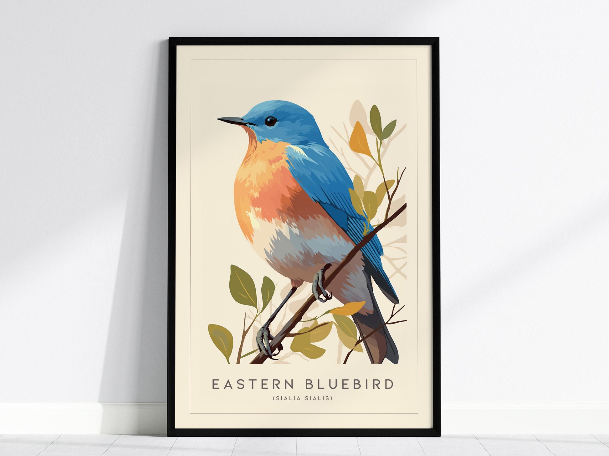 The Eastern Bluebird is often seen as a harbinger of happiness, making this print a meaningful gift for birthdays, housewarmings, or anyone who finds peace in the quiet presence of songbirds.