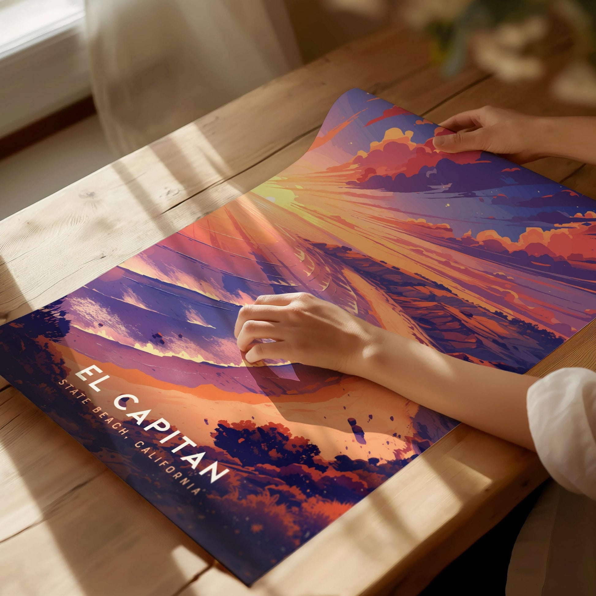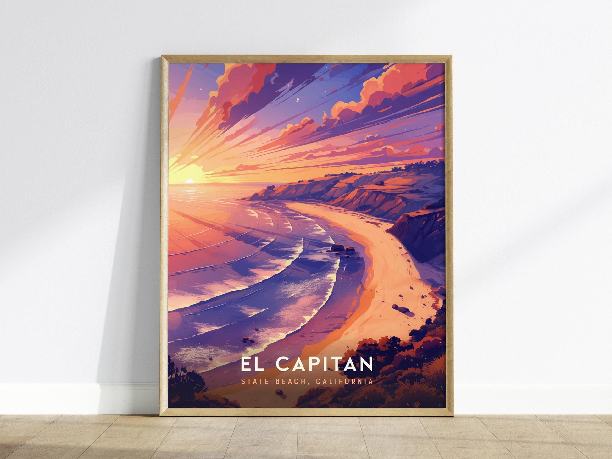This bold, colorful print captures the golden hour at El Capitan State Beach, where the rugged cliffs of Santa Barbara County meet the glistening Pacific. Inspired by warm sunsets, soft sand, and endless surf, its a nostalgic tribute to long beach walks and coastal drives along Highway 101. Whether youve camped here, surfed the break, or simply admired the view, this piece brings that magic home.