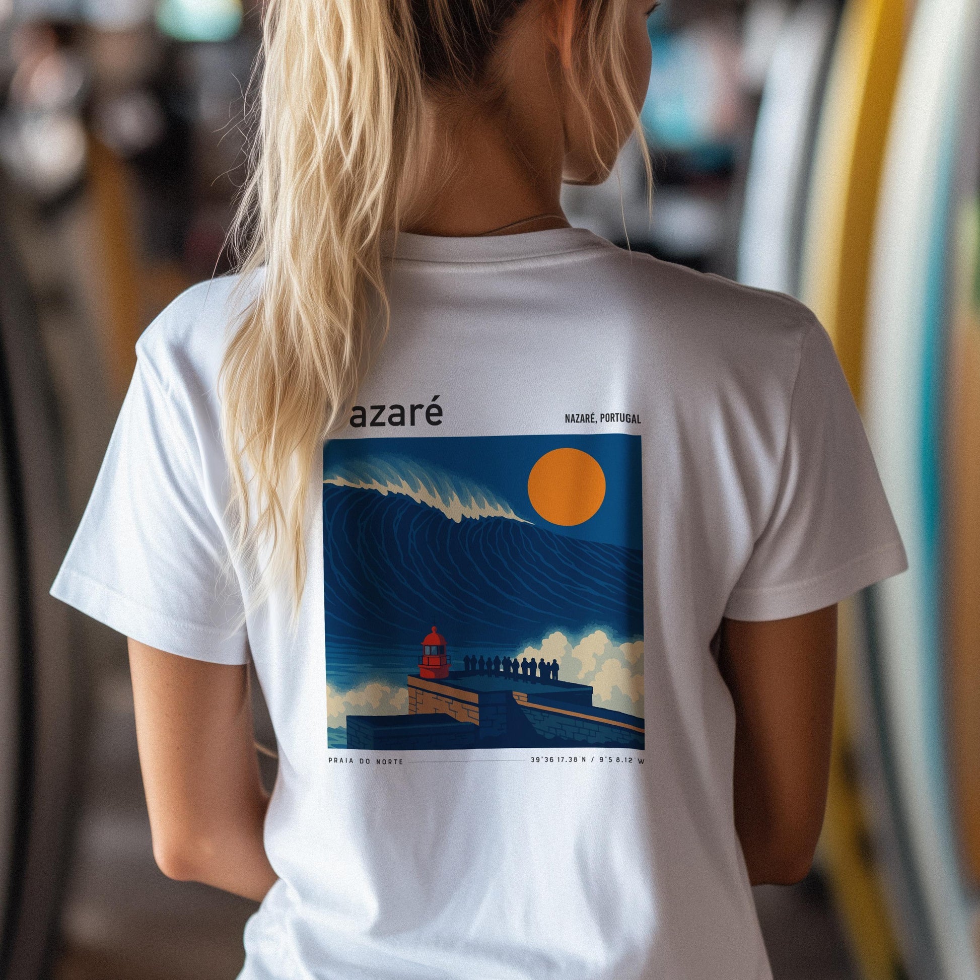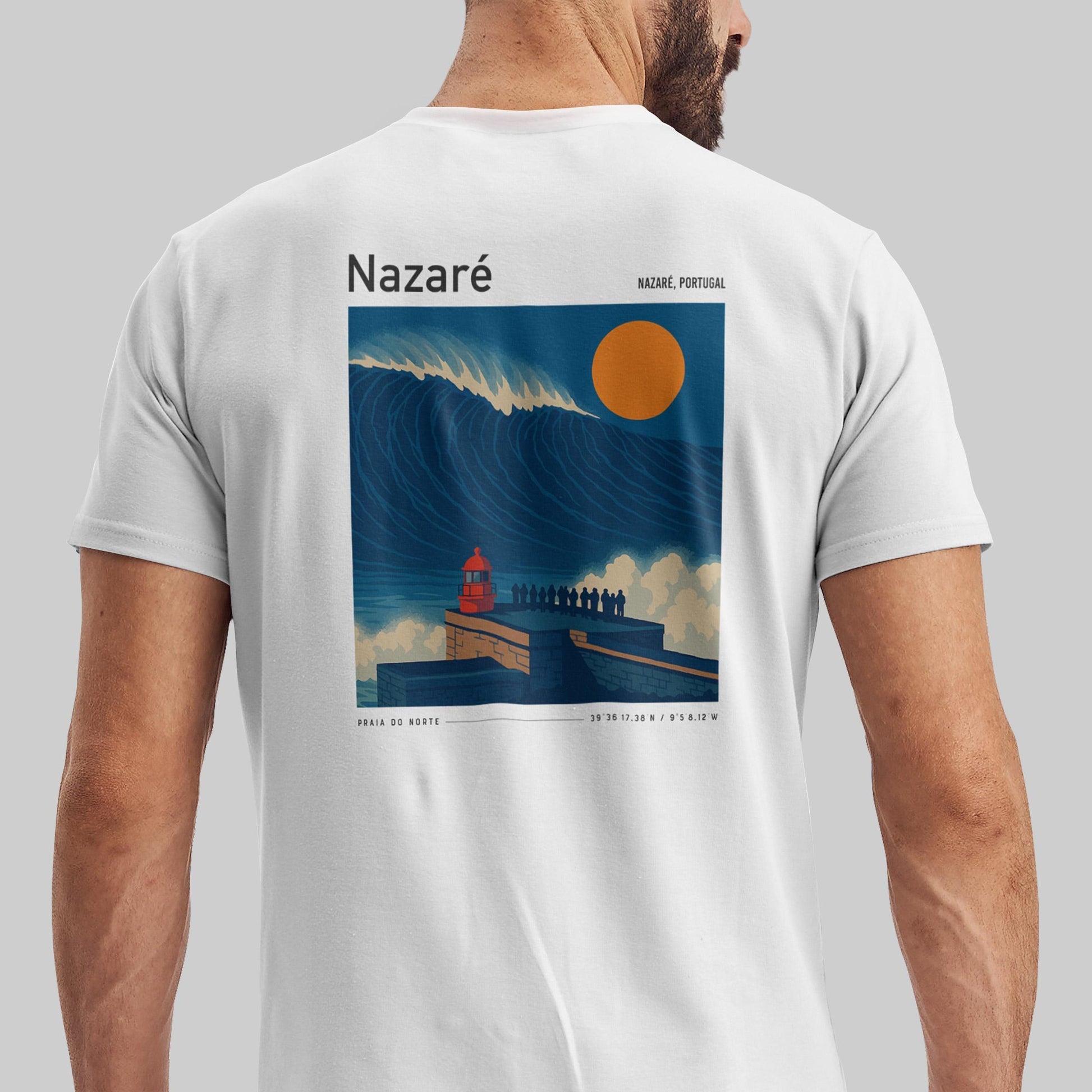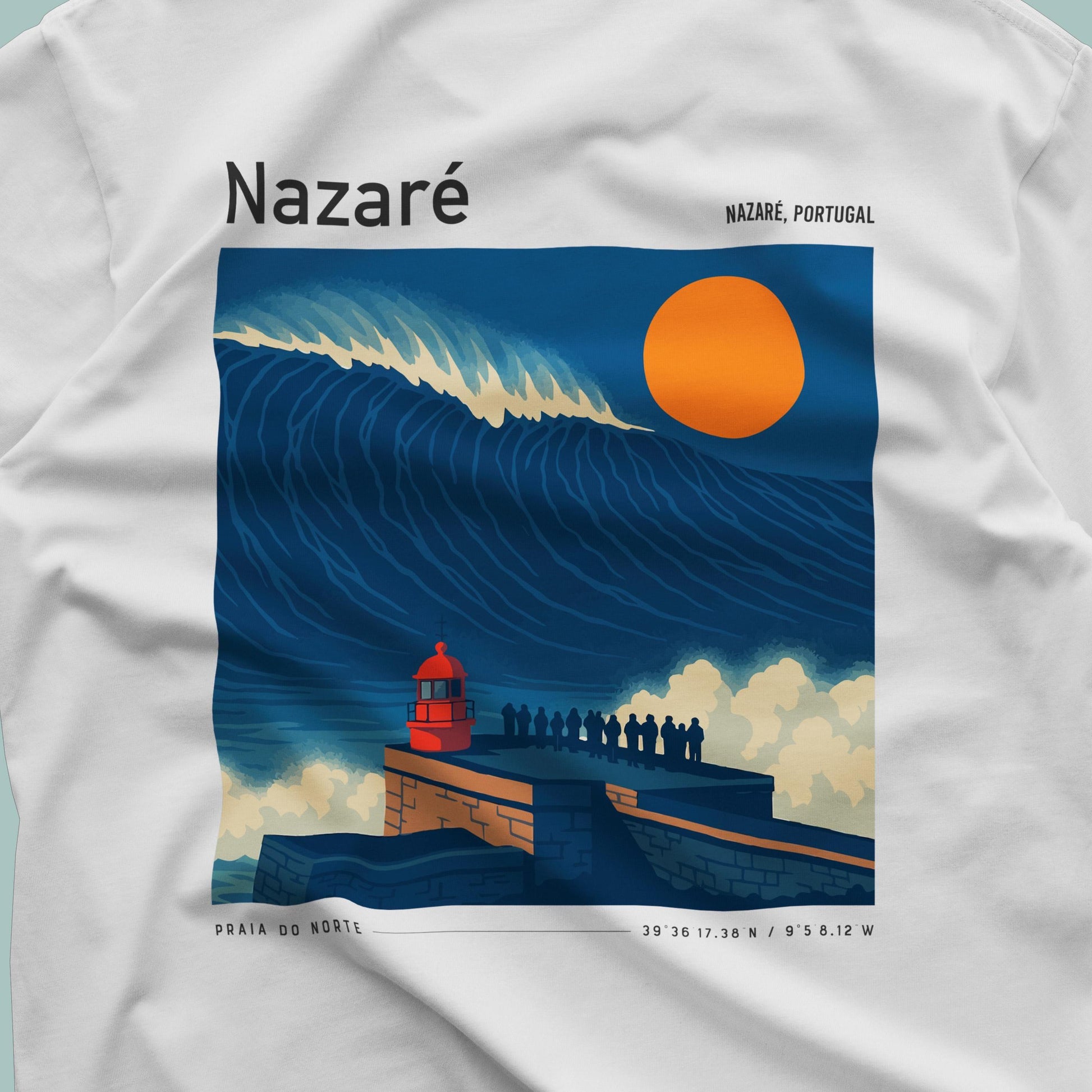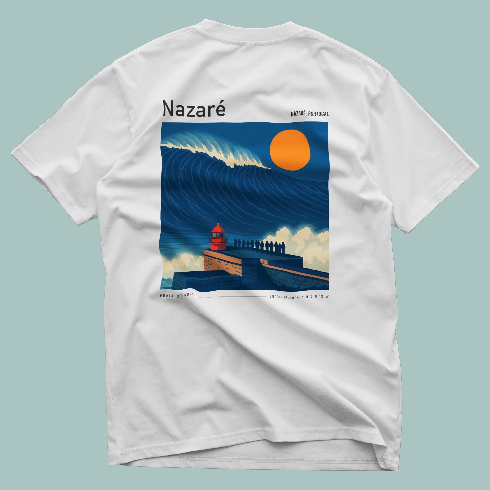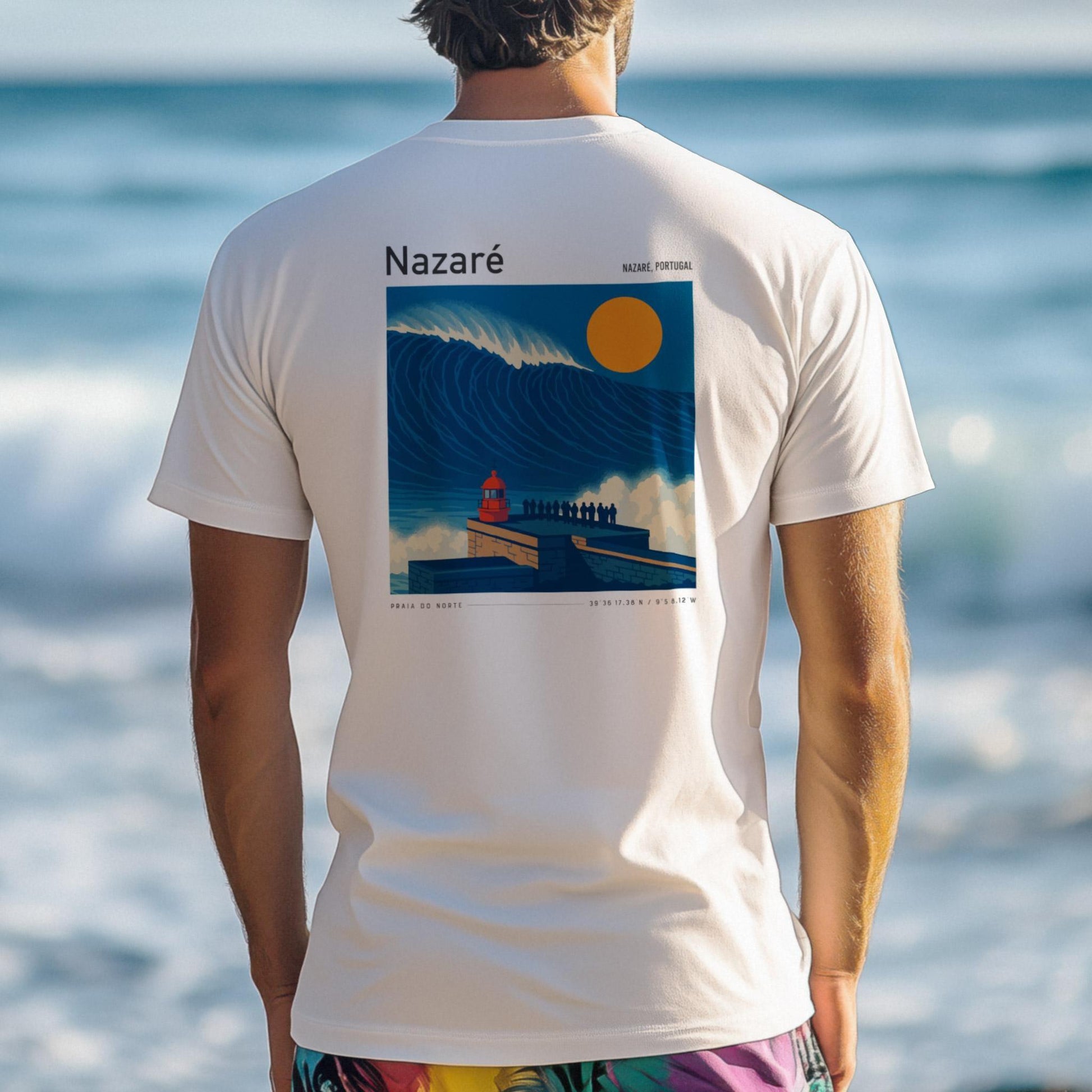 Ride the legend of Nazaré with this premium pocket tee from Swell Scenes. Featuring our bold, vintage-style back graphic of Praia do Norte and the towering waves that made Nazaré world-famous, this surf shirt pays homage to one of the most iconic big wave spots on the planet. Made from ultra-soft 100% ring-spun cotton, the shirt has a relaxed fit and a throwback vibe thanks to the Swell Scenes logo on the front pocket and large artwork on the back. Whether youve paddled out at Nazaré or dream of standing on that cliffside, this shirt lets you wear your favorite break with pride.