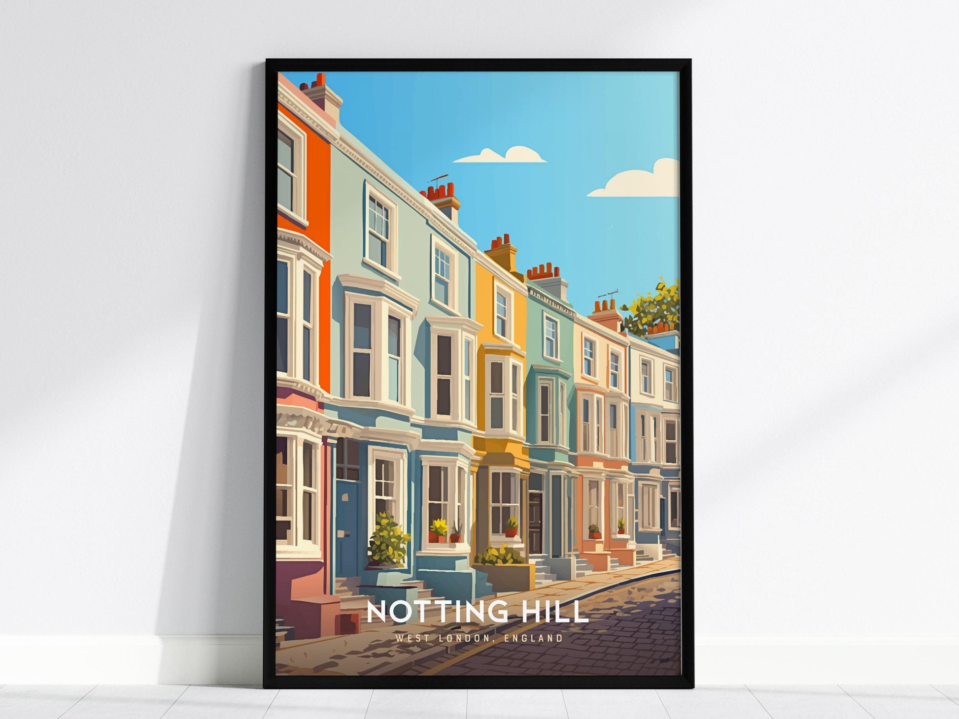 Located in West London, Notting Hill is famed for its colorful terrace homes, vibrant market culture, and starring role in one of cinema’s most iconic love stories. This print captures the charm of the neighborhood as immortalized in film and everyday life.