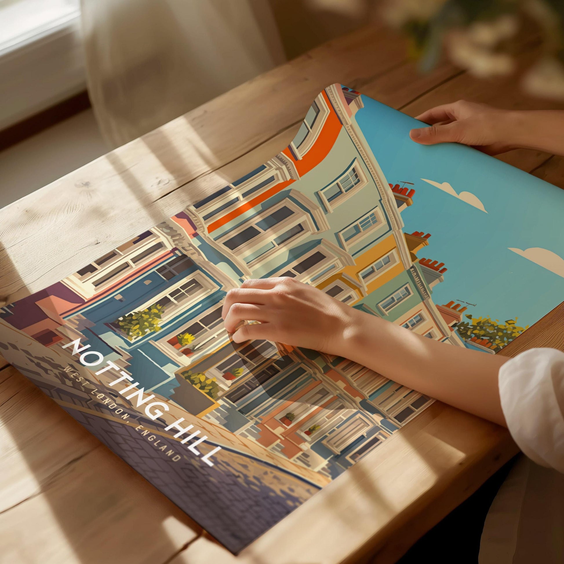 The print’s bright colors and clean design make it ideal for anyone who’s wandered Portobello Road or dreamed of cinematic love stories in London. Whether hung in a cozy reading nook or modern flat, this piece brings a sense of whimsy, warmth, and wanderlust.