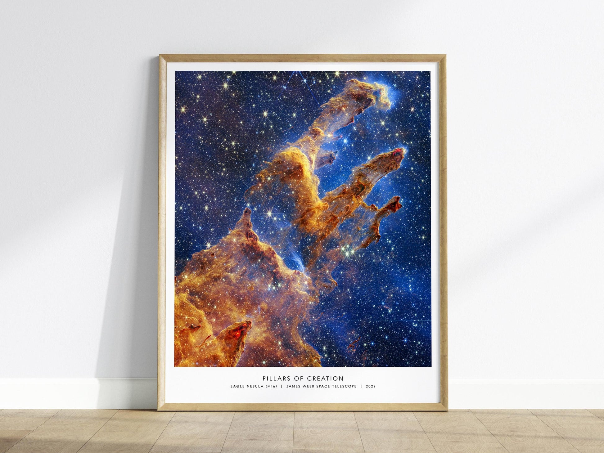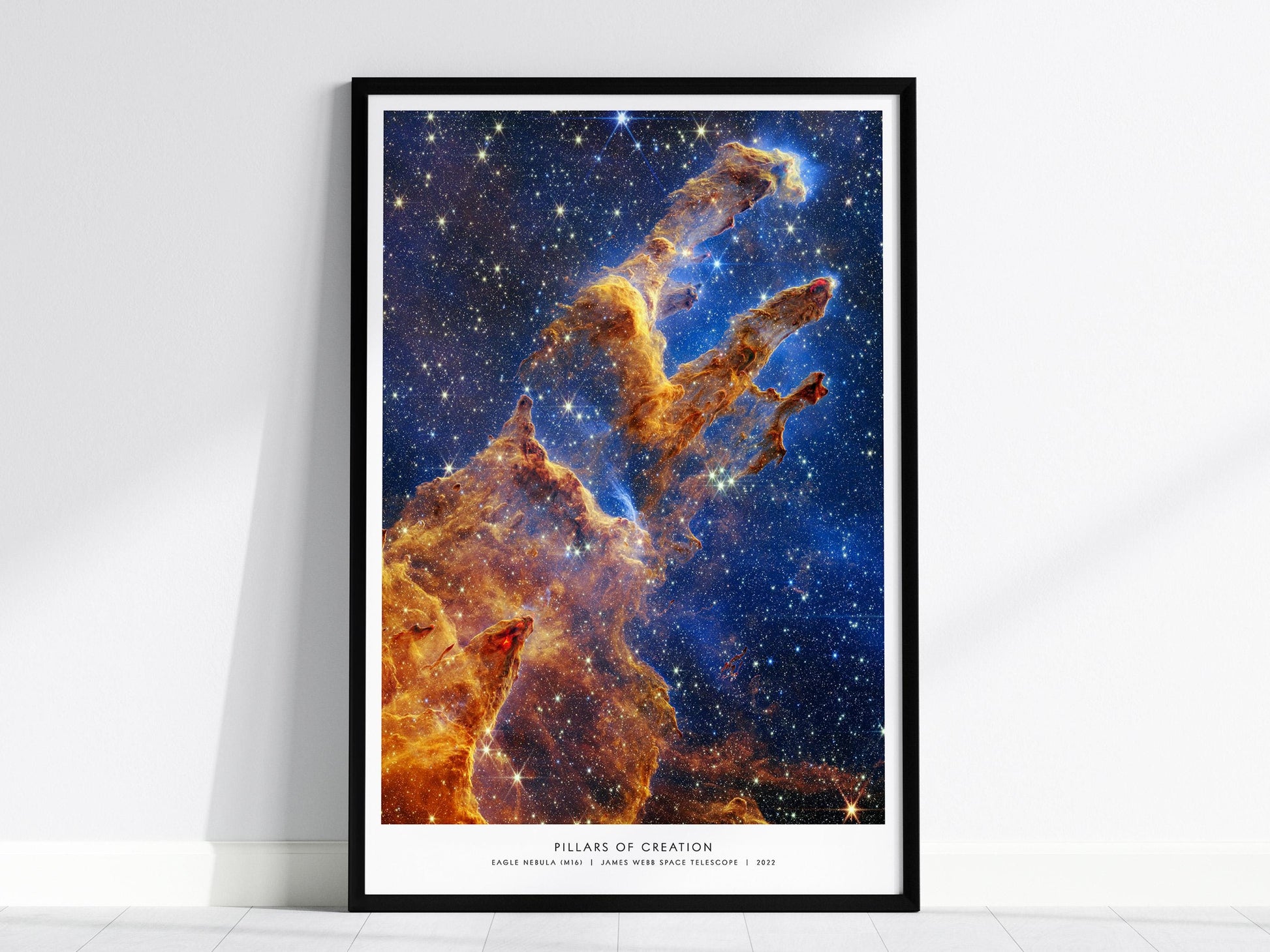 Add a jaw-dropping piece of the cosmos to your wall with this museum-quality poster of the Pillars of Creation, captured by the James Webb Space Telescope in 2022. Featuring intricate plumes of gas and dust set against a backdrop of infinite stars, this image of the Eagle Nebula (M16) reveals one of the universes most iconic star-forming regions in never-before-seen clarity.